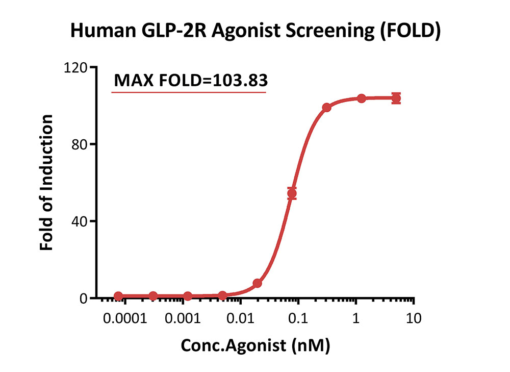 This reporter cell was incubated with serial dilutions of human GLP-2R agonist. The max induction fold of human GLP-2R agonist (Glepaglutide) was approximately 103.83.Protocol