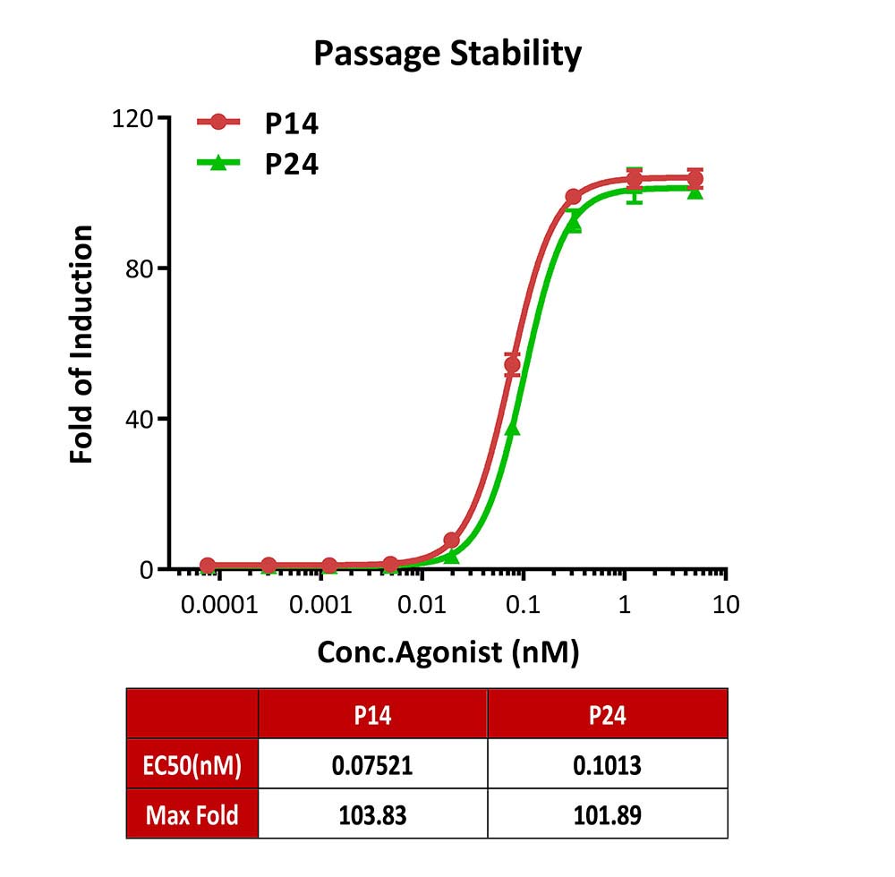 The continuously growing Human GLP-2R (Luc) HEK293 Reporter Cell was stimulated with serial dilutions of human GLP-2R agonist (Glepaglutide). Glepaglutide stimulated response demonstrates passage stabilization (fold induction and EC50) across passage 14-24.Protocol